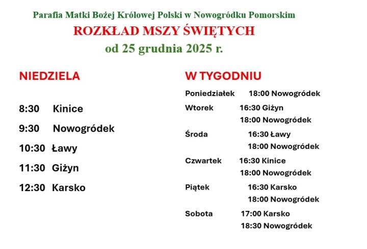 Już dzisiaj informujemy o nowym rozkładzie Mszy Świetych, kóry będize obowiązywał od 25 grudnia 2025 r. w naszej parafii